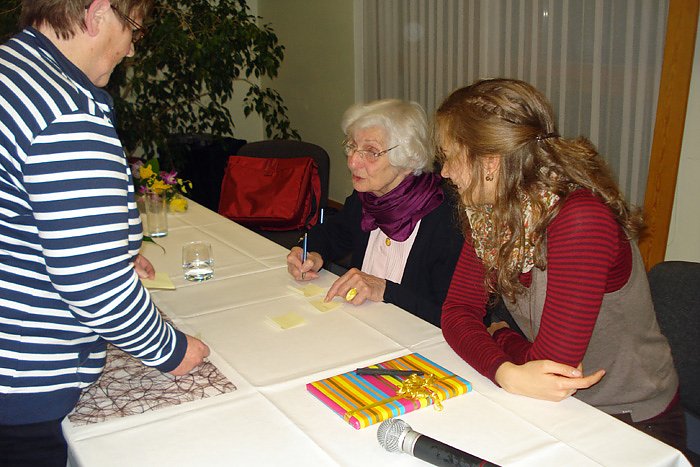 Im Winter 1944/1945, inzwischen im Arbeitslager Stadtallendorf in Hessen, will sie in der Kälte fast aufgeben zu leben, aber die Erinnerung an die Familie und ein eiserner Wille lässt sie überleben. Heute ist Frau Pusztai dankbar dafür, dass man sich in Deutschland viel mehr als in Ungarn, das schließlich mit Nazideutschland kollaborierte, mit der Vergangenheit aktiv auseinandersetzte. Es gab viel Beifall für die Lesung von Frau Vogt und tief gehende Dankesworte durch die Autorin Eva Pusztai. Nach einer Pause stellte sich nun die Autorin selbst den Fragen des Publikums. Sie nahm Bezug darauf, warum sie im hohen Alter von fast 88 Jahren immer noch aktiv ist, um bei den Menschen das Vergessen an die schreckliche Zeit des Holocaust zu verhindern.