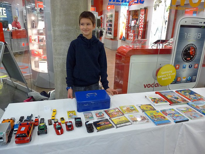 Insgesamt 53 Ständen waren in der Galerie am Schlossberg aufgebaut. Es herrschte ein Ansturm wie noch nie, so die Marktmeisterin, sowohl von den Anbietern, als auch von den potentiellen Kunden. Obwohl der Trödelmarkt erst um 08:00 Uhr öffnen sollte, standen eine ganze Reihe Kinder schon um 07:30 Uhr "auf der Matte", um sich einen Spitzenplatz zu sichern.