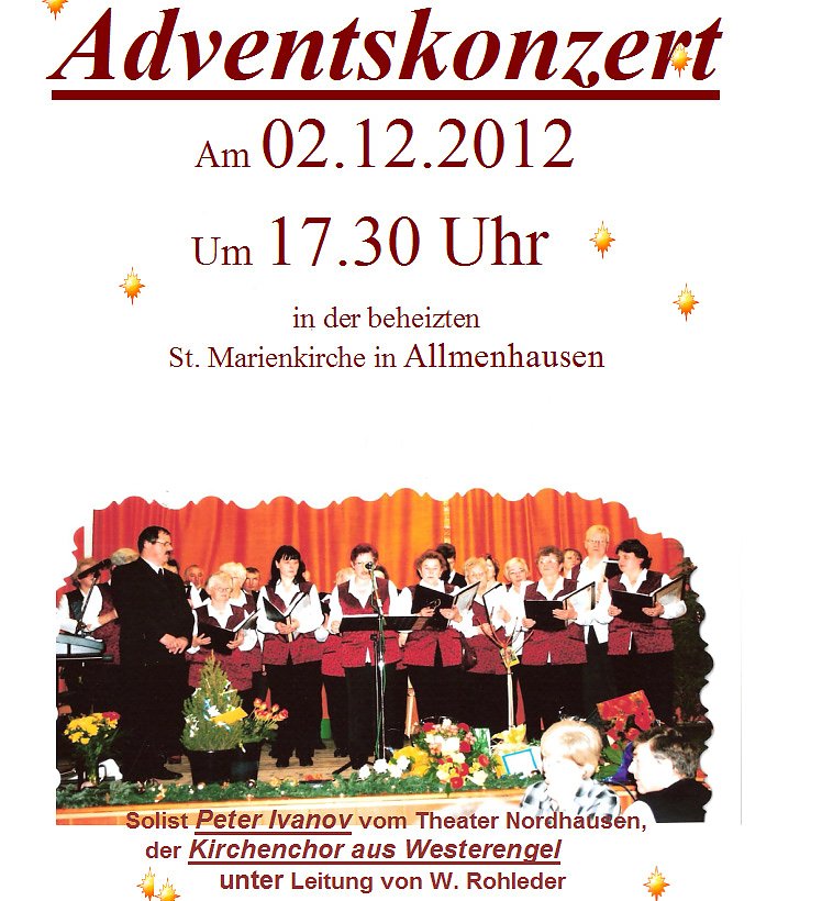 Am 02.12.2012 um 17.30 Uhr findet in der beheizten St. Marienkirche in Allmenhausen ein Adventskonzert statt.