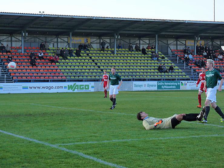 Sieht gefährlich aus. War es auch, denn der Ball klatscht an den Pfosten vom geschlagenen Tormann aus Martinroda. Der zurückspringende Ball konnte nicht genutzt werden. Es war eigentlich die einzige richtige gefährliche Torszene der ersten Halbzeit.