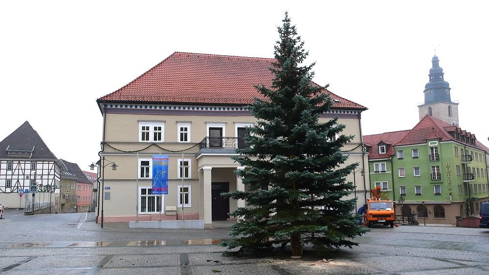 Autor: khhPassend zum 1. Advent steht ab heute vormittags eine ca. 10 m hohe Blautanne auf dem Sondershäuser Marktplatz. Der Baum stammt von dem städtischen Grundstück des Sondershäuser Hauptfriedhofes.