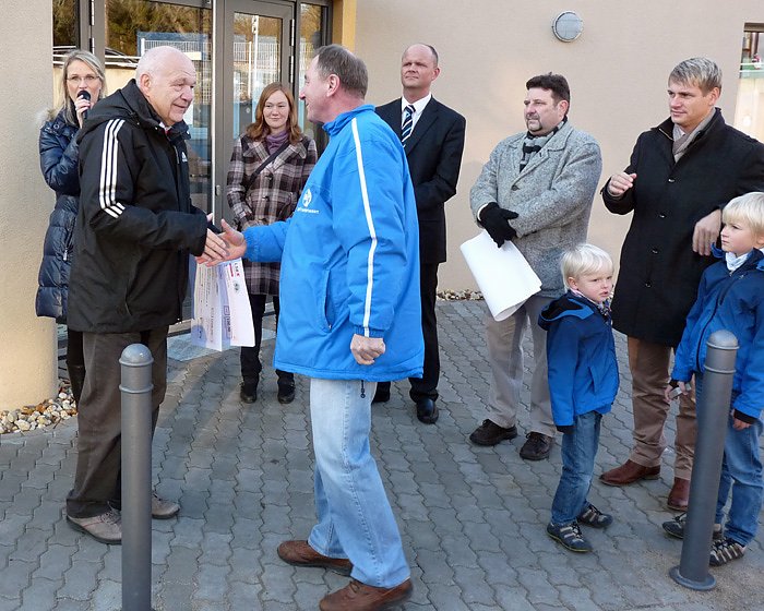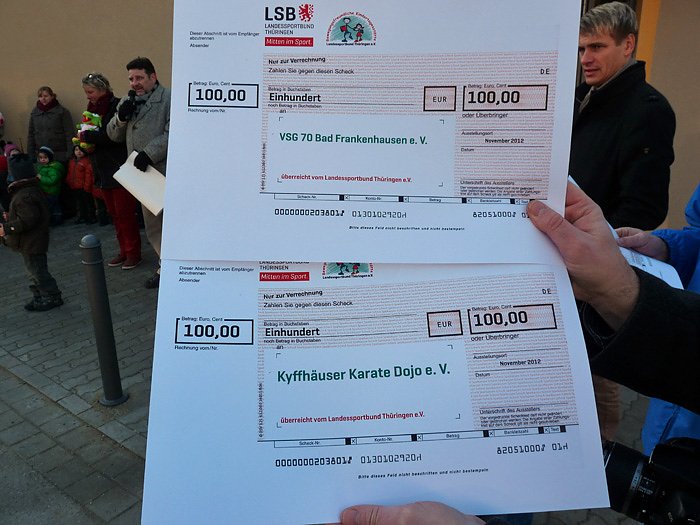 Der Präsident des Thüringer Landessportbundes, Peter Gösel, übergab heute einen Scheck in Höhe von 100 Euro an den SV Blau-Weiß 91 Bad Frankenhausen e.V., den Sportfreund Ralf Töppe überreicht bekam. Aber auch zwei andere Vereine konnte sich über eine Zuwendung freuen.
