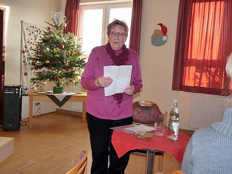 Es wurde aber nicht nur gegessen und getrunken. Man erzählte viele Geschichte und Gedichte aus der Weihnachtszeit. So erzählte Frau Geyer Geschichten in Mundart. Nicht nötig, war ihre Entschuldigung: "Als über 80-zig Jährige muss ich vom Blatt ablesen", sagte sie. Mancher Jüngere wäre froh, wenn er in dem Alter noch so rüstig wäre.