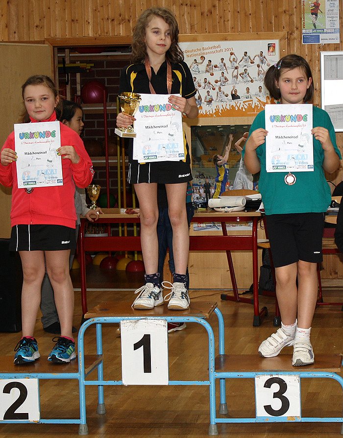 Die 3 Mädchen, Annouk Tobien, Desiree Stefan und Satine Tobien (Foto) wussten durchweg zu überzeugen. Annouk, die die Rangliste in dieser Saison anführt, setzte sich erwartungsgemäß durch und siegte ohne Satzverlust. Damit ist sie überlegene Favoritin für die Landesmeisterschaften im April in Mühlhausen. Spielt sie konzentriert, gewinnt sie gegen alle Gegnerinnen einstellig. Desiree konnte sich diesmal bis ins Finale spielen, wo sie gegen ihre Freundin verlor. Die Ranglistenpunkte für Platz 2 sind sehr wichtig, um sich zur Meisterschaft eine günstige Ausgangsposition zu schaffen. Das Küken, die 6-jährige Satine, ja noch Kindergartenkind, verzückte so manchen Zuschauer. Selbstbewusst absolvierte sie ihre Spiele und konnte sogar 3 gewinnen. Lustig anzuschauen, wie sie ihre 2 Jahre älteren Gegnerinnen dirigierte. Sprüche wie: Wollen wir nun endlich anfangen oder Ich hab nicht, du hast Aufschlag, los sind da nur 2 Beispiele fürs Selbstbewusstsein des Frankenhäuser Zwerges. In 2 Jahren, wenn sie eigentlich in dieser Altersklasse angekommen sein wird, wird sie die rocken.