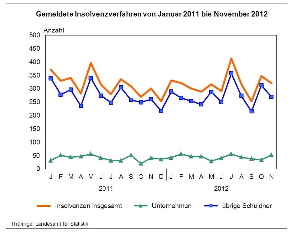Die Thüringer Amtsgerichte entschieden in den ersten elf Monaten 2012 über 3 497 Insolvenzverfahren. Davon entfielen 13,9 Prozent auf Unternehmen und 86,1 Prozent auf übrige Schuldner*. Einzelheiten wie immer in Ihren Nordthüringer Online-Zeitungen...