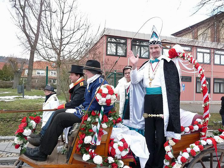 "Ob Rock, Pop, Schlager, Firlefanz - der FKK kennt jeden Tanz. Das Prinzenpaar des FKK Wipperveilchen Session 2012/2013 Verena I. & Matthias I. fuhren gleich hinter dem Fanfarenzug Bad Frankenhausen, der nicht in seinem üblichen Aufzug erschien.