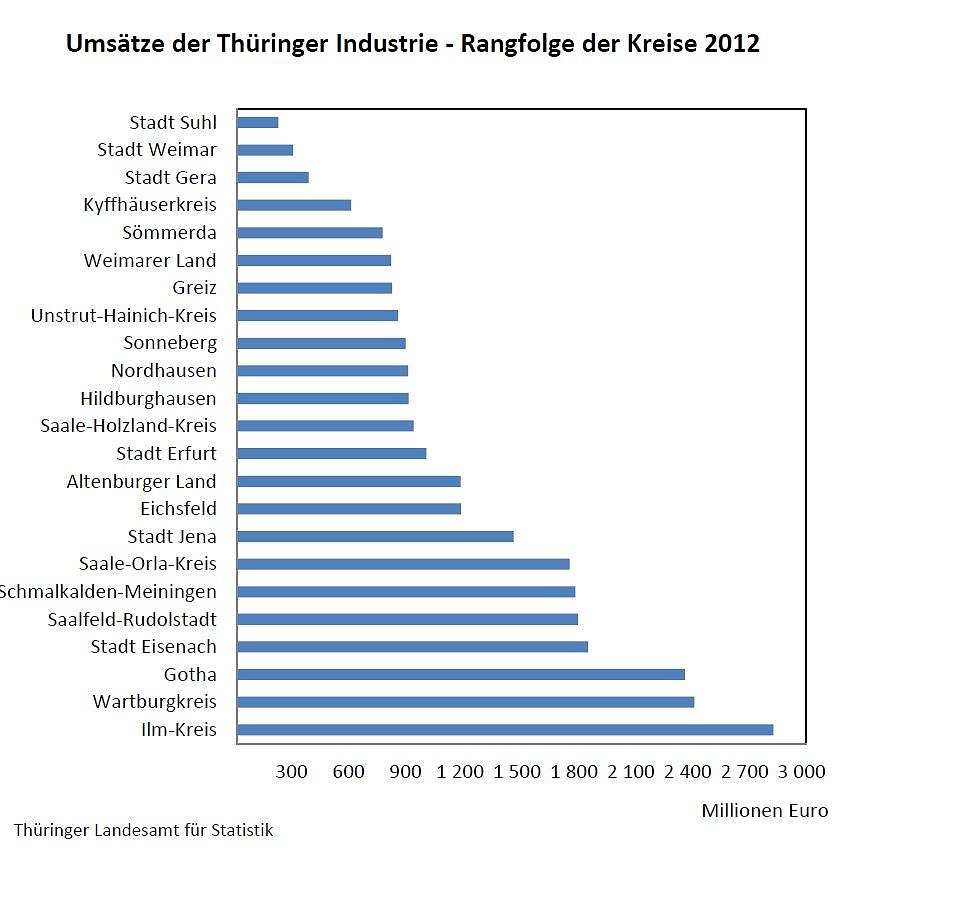 Der Ilm-Kreis konnte seine Position das gesamte Jahr 2012 behaupten und belegte mit einem Umsatz von 2,8 Milliarden Euro den Spitzenplatz. Als Zweiter folgt der Wartburgkreis mit über 2,4 Milliarden Euro und danach der Landkreis Gotha mit fast 2,4 Milliarden Euro. Beste kreisfreie Stadt war Eisenach mit 1,8 Milliarden Euro Umsatz. Zu den führenden Landkreisen Thüringens gehörten weiterhin der Landkreis Saalfeld-Rudolstadt, der Landkreis Schmalkalden-Meiningen und der Saale-Orla-Kreis mit jeweils rund 1,8 Milliarden Euro Umsatz.