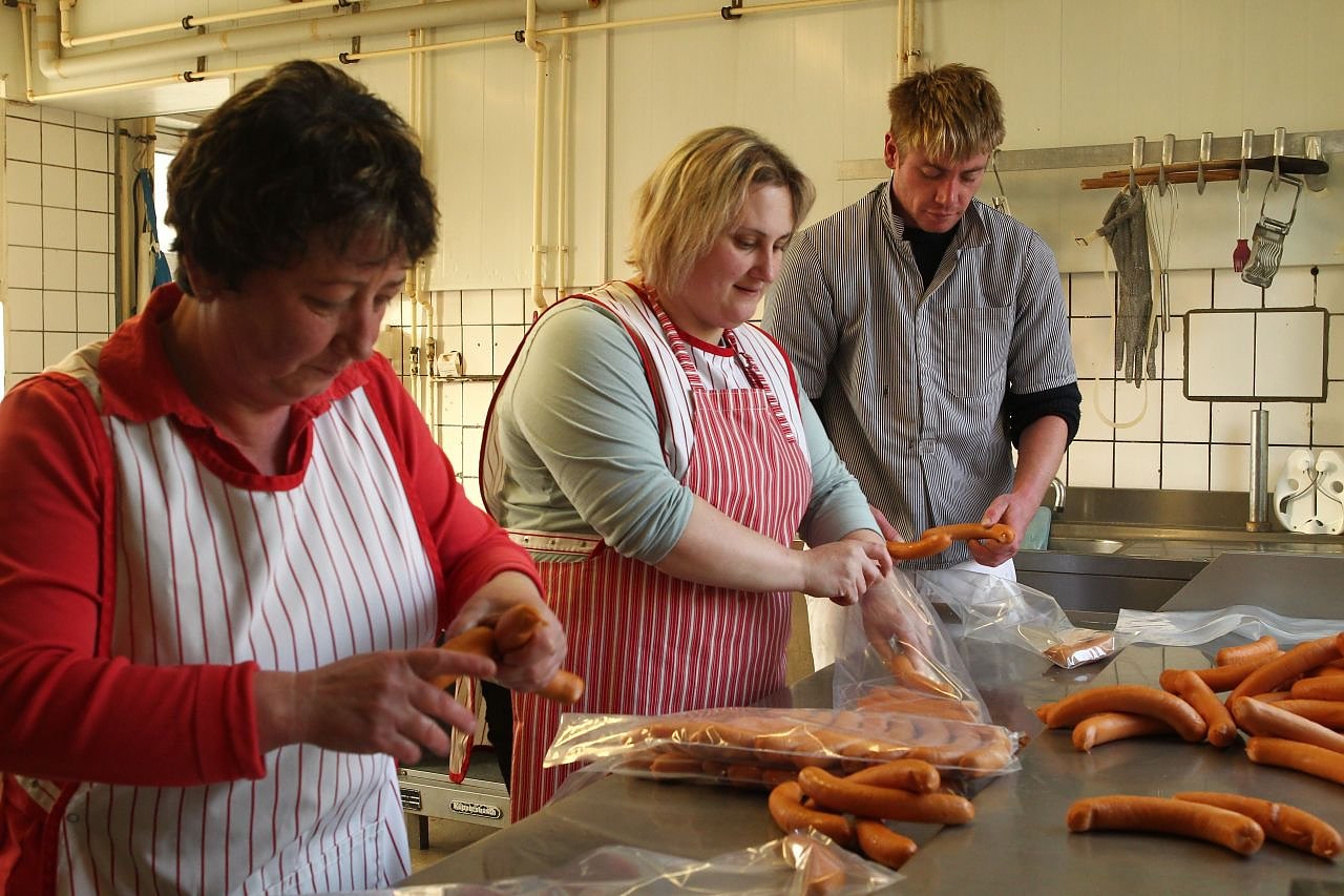 Iris und Nadine Setzepfand sowie Daniel Schäfer bei Verpacken von Bockwürstchen.
