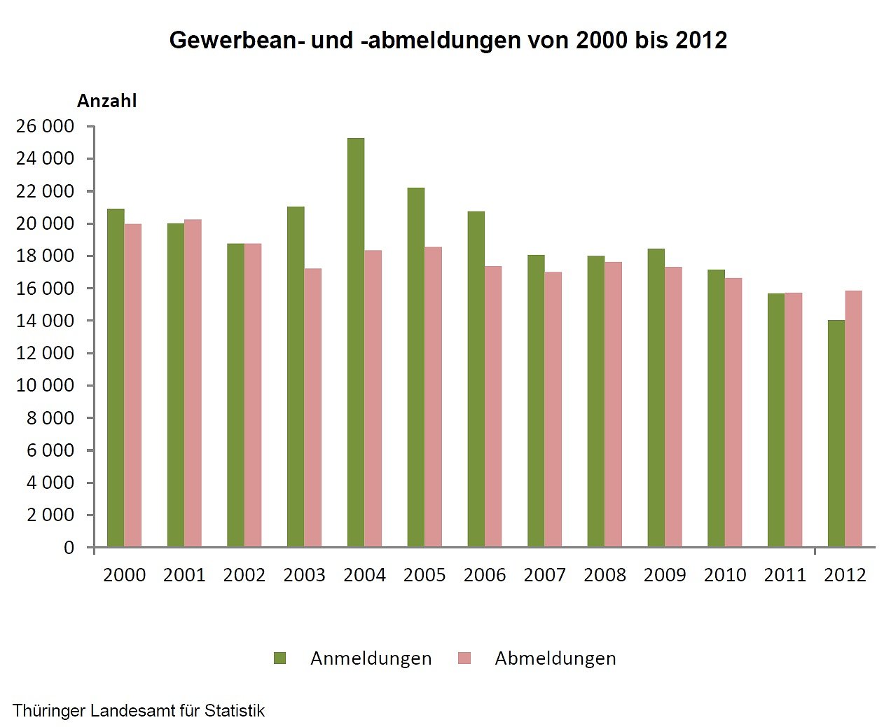 Somit wurden im Jahr 2012 so wenig Gewerbe angemeldet, wie noch nie seit 1991. Die Anzahl der Gewerbeabmeldungen liegt dagegen mit 15 861 knapp über dem Vorjahresergebnis (2011: 15 741).