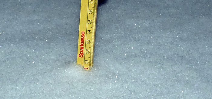Noch etwas günstiger sieht es aus, wenn man die Schneehöhe über dem Asphalt misst. Dadurch das es gestern noch recht warm war, ist über Flächen wie Asphalt oder Steinplatten kaum etwas in den ersten drei Stunden liegen geblieben. Die Gute Nachricht, es schneit zur Zeit nicht.