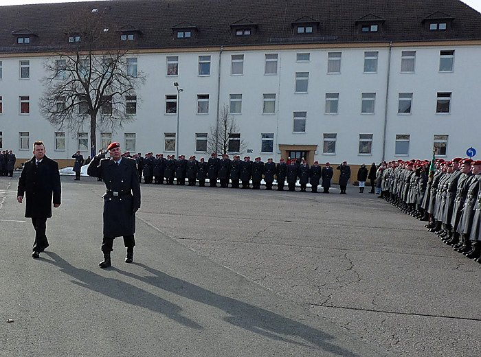 Oberst Hermeling und der 1. Beigeordnete Holger Häßler, der die erkrankte Landrätin Antje Hochwind (SPD) vertrat. Oberst Hermeling hielt in seiner Rede eine Rückschau auf 22 erfolgreiche Jahre des Bataillons. dabei stellte er fest, "das besondere Verhältnis zwischen der Bundeswehr und den lokalen politischen Akteure und nicht zuletzt den Bewohnern dieser Stadt sowie des Landkreises zeigte sich in der Vergangenheit durch gegenseitige tatkräftige Unterstützung. Die Integration der Bundeswehr in die Gesellschaft hat sich hier beispielhaft vollzogen."