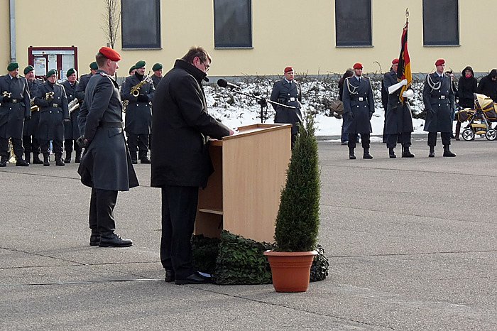 Bei zwar trockenem Wetter und leichtem Sonnenschein litt die Feierlichkeit doch etwas unter den sehr eisigen Witterungsverhältnissen und des sehr unangenehmen eisigen Windes. Leidtragender war das Wehrbereichsmusikkorps III unter der Leitung von Chefdirigent Oberstleutnant Roland Kahle. Nach dem noch klangvollen Einmarsch und den ersten Reden musste Kahle an den Kommandeur des Verabschiedungs- und Auflösungsappells die Meldung machen, die Instrumente sind eingefroren, was natürlich allseits ein Schmunzeln hervorrief.