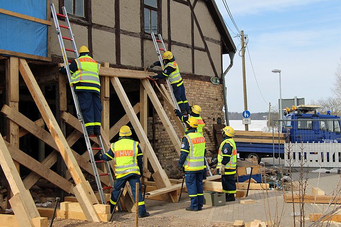 Nach einem statischen Gutachten errichtete das Team von Michael Hannig eine Wandabstützung. Die 19 Helfer vor Ort waren bei eisigen Temperaturen beschäftigt mit ablängen und ausklinken von Holzbalken, mit den abmaßen von 14x14 cm, sowie das verschrauben und vernageln der Gesamtkonstruktion. Dieser Einsatz zählt zu den Hauptaufgaben, und wird auch ständig bei Ausbildungen geübt. Die Arbeiten waren nach ca. 5 Stunden abgeschlossen und das Einsatzteam konnte in ihr wohlverdientes Wochenende gehen.
