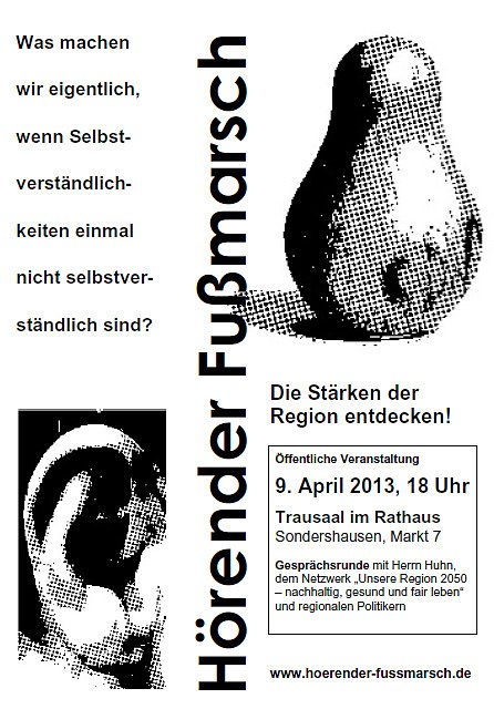 Am Abend des 9. April 2013 kommt der Hörende Fußmarsch nach Sondershausen und macht hier Station. Eine Gruppe von Thüringern, die parteilich nicht gebunden ist, möchte vom 1. April bis 31. Mai 2013 folgendes Anliegen zu Fuß ins Land tragen und zur Diskussion stellen.