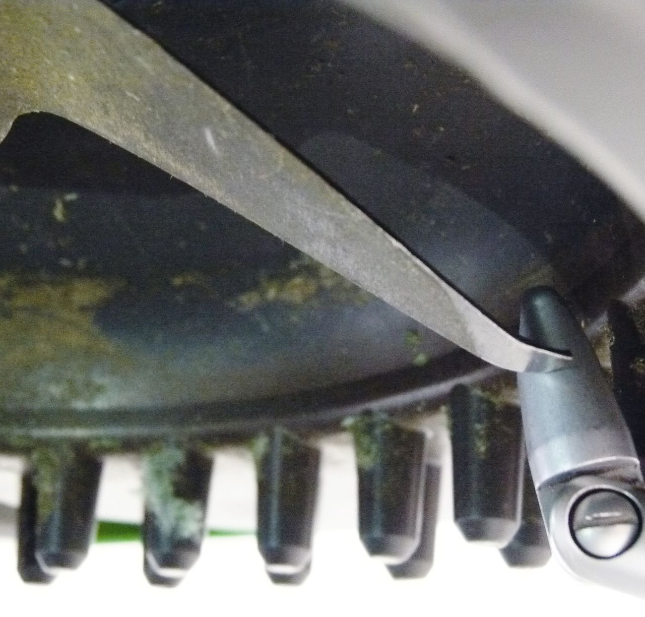 Die Mähroboter werden im Labor genau unter die Lupe genommen: Hier greift ein Metallfinger ins Messer.
