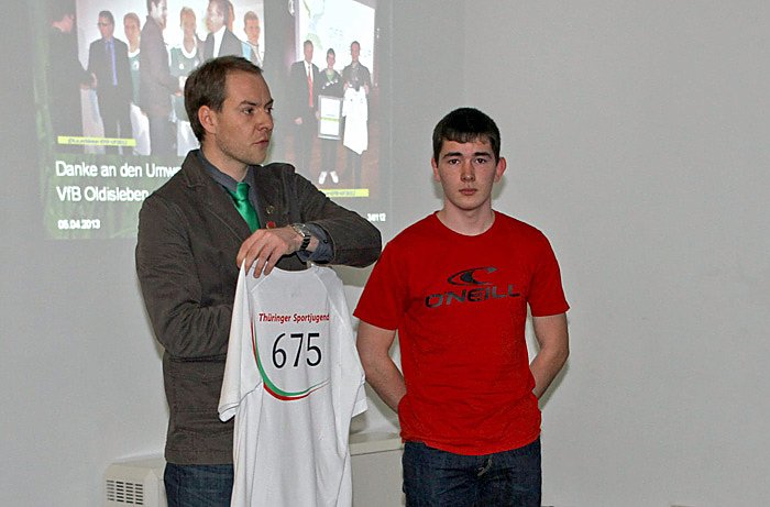Hier ist der Umweltbeauftragte Erik Zimmermann an erster Stelle zu nennen, welcher sich für Umweltmaßnahmen im Verein stark gemacht hat. Am Ende der Aktion erreichte der VfB Oldisleben einen 10. Platz auf Bundesebene und den 1. Platz in Thüringen. Die große Auszeichnung wurde in der DFB Zentrale in Frankfurt/Main dem VfB Oldisleben e.V. für sein Engagement in Umwelt- und Klimaschutz von Thomas Röber und Erik Zimmermann in Empfang genommen. Am Ende fragt man sich: Wieso hat kein Profi-Verein in Thüringen an dieser Aktion teilgenommen, um etwas für seine Werbung zu tun?