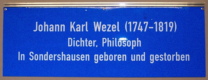 Hierzu zählt auch die Johann-Karl-Wezel-Straße, die das Andenken des großen Sondershäuser Dichters und Philosophen Johann Karl Wezel (1747-1819), dessen Sterbehaus sich bis zur Neubebauung in den achtziger Jahren hier befunden hatte, in der öffentlichen Erinnerung behalten soll.