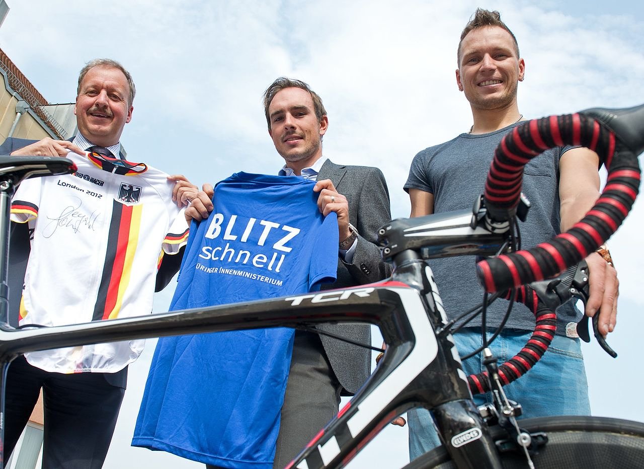 Gemeinsam mit Marcel Barth, der wie Degenkolb Polizeimeister ist und im Thüringer Energie Team aktuell dabei hilft, talentierte Nachwuchsfahrer an eine Profikarriere heranzuführen, schaute John Degenkolb bei Innenminister Jörg Geibert vorbei und hatte dabei ein wertvolles Souvenir im Gepäck: das von ihm signierte Trikot vom olympischen Straßenrennen auf der Londoner Mall, das nun in nächster Zeit für einen guten Zweck versteigert werden soll.