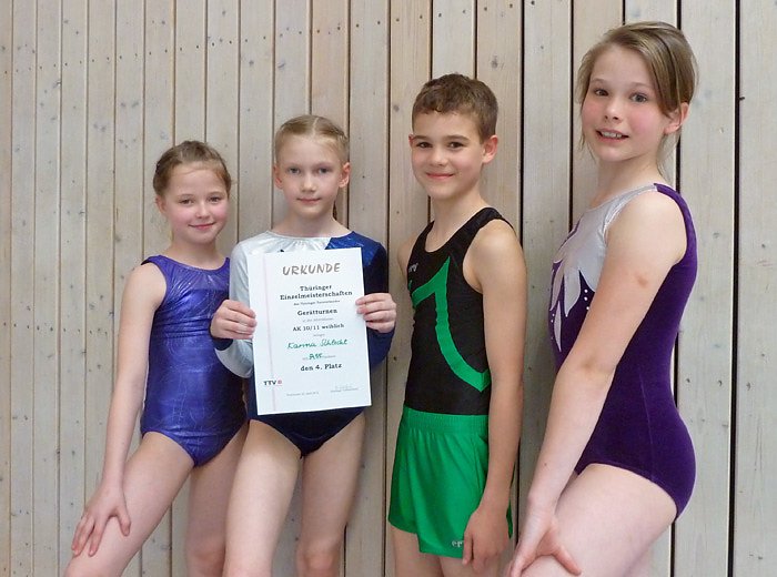 In diesem Jahr war der Gastgeber der Landesmeisterschaften Rudolstadt. Jedes Jahr im Frühjahr finden die Einzelmeisterschaften statt. Für die Mädchen und Jungen, die gerade die Altersklasse gewechselt haben, ist das Erlernen neuer Übungen an höheren(und bisher unbekannter Geräte), eine große Aufgabe. Geturnt werden Pflichtübungen an allen Geräten, mit unterschiedlichen Ausgangswerten.