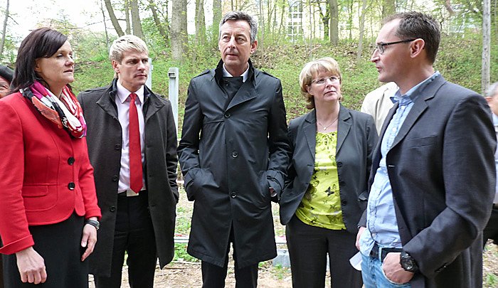 Witzenhausen (re.) erläutert der Thüringer Staatssekretärin für Bau, Landesentwicklung und Verkehr, Inge Klaan, und dem Staatssekretär des Thüringer Wirtschaftsministeriums Jochen Staschewski, seine Projektvorstellungen. Mit Landrätin Antje Hochwind (SPD) und Bad Frankenhausens Bürgermeister Matthias Strejc (SPD) hat er interessierte Zuhörer. Strejc hat ja selbst in Bad Frankenhausen einen Bahnhof.