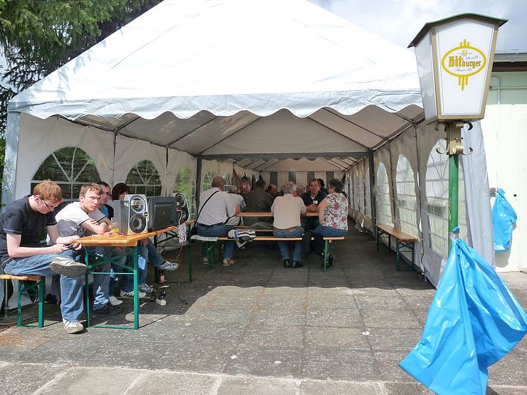Sie denken, hier ist kein Platz mehr frei? Günter Gemsjäger hat noch Bänke in der Hinterhand. Zum Bier kann man auch paar "Wackelmänner" bestellt. Und damit man nicht vom "Fleische" fällt gibt es Brätel oder Bratwurst. Sie mögen Fisch? Gibt es auch. Bismarck-Hering geliefert direkt aus Auleben.