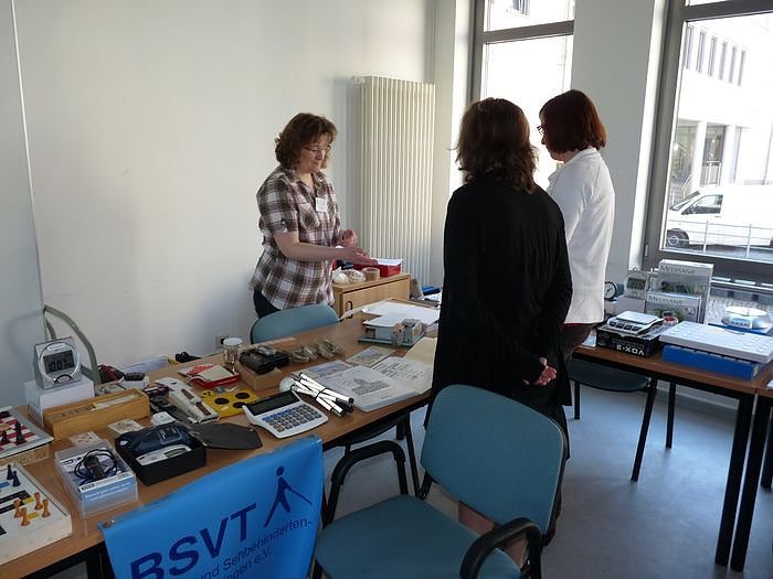 Noch bis 16:00 Uhr können sich interessierte Bürger nicht nur über die Arbeit des Verbandes informieren, sondern es werden auch wichtige Hilfsmittel für Blinde und sehbehinderte Bürger vorgestellt.