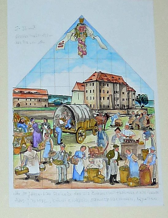 Tempel erläutert hier Vorstandsvorsitzender der Kyffhäusersparkasse Ulrich Heilmann (ganz rechst) und Norbert Enke weitere Einzelheiten zum Gemälde. Natürlich sollten die wichtigsten Sehenswürdigkeiten und Merkmale vereint sein, die Wasserburg, die Zwiebeln, für die die Region bekannt ist und die Handel treibenden Zwiebelbauern sollen dargestellt werden.