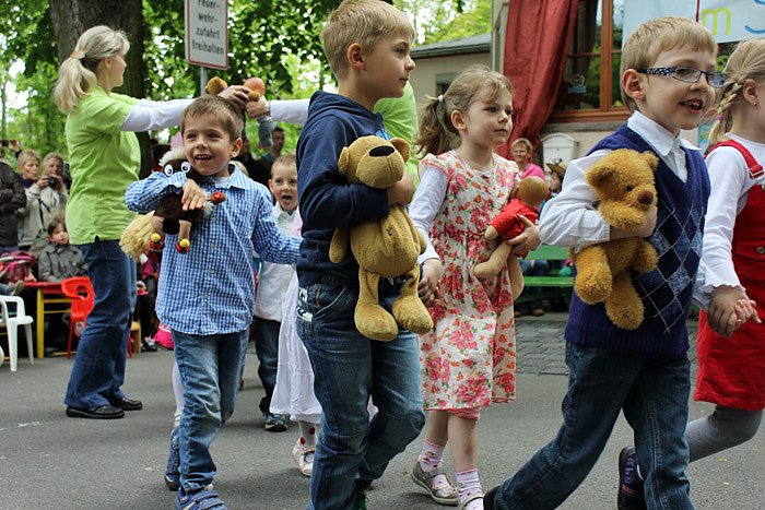 In diesem Jahr stand das Fest unter dem Motto "Im Spielzeugland". In den vergangenen Wochen wurde eifrig gebastelt und geübt, somit konnte jede Gruppe ihr Lieblingsspielzeug beim musikalischen Programm präsentieren. Zu sehen waren dabei viele kleine Teddys, Frösche, Hampelmänner, Cowboys und Gespenster. Es wurde mit dem Ball gespielt oder mit der Lieblingspuppe getanzt. Selbst die Indianer oder die Roboter fehlten nicht. Die dicht gedrängten Gäste sparten nicht mit Applaus, denn die Kinder zeigten in schicken Kostümen gelungen ihre musikalische Begeisterung und Können. Für viel Freude sorgte bei allen der große Teddybär, alias der Hausmeister Mike Heide, der sich unter das Treiben mischte.