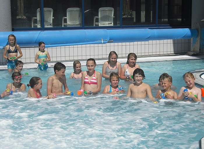 Für die ganz Kleinen gibt es Spiele im Kinderbecken wie z.B. Entchen angeln oder Ringe werfen. Bei schönem Wetter laden zudem die große Liegewiese und der Außenpool für Spiele ein. Hier können die Kinder bei Ballspielchen oder Frisbee werfen, sich einmal so richtig austoben.