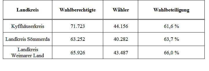Von den drei Landkreisen wurde nach gemeinsamen Absprachen Herr Dr. Heinz-Ulrich Thiele zum Kreiswahlleiter und Herr Ralf Busch (beide Landratsamt Kyffhäuserkreis) zu seinem Stellvertreter durch den Innenminister des Freistaats Thüringen ernannt.