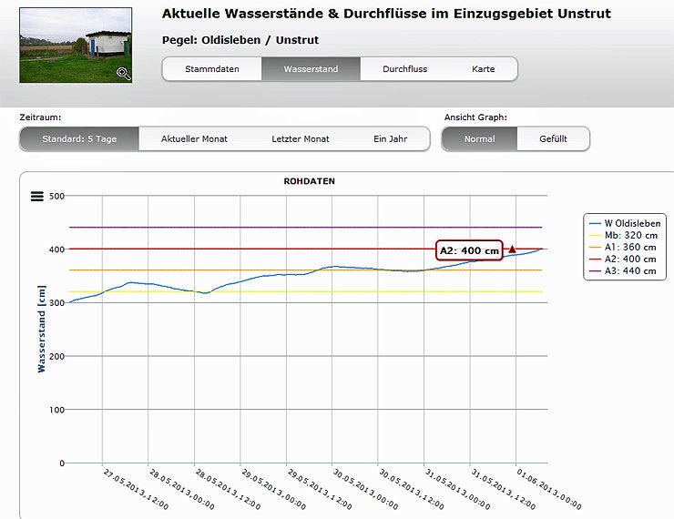Oldisleben: Warnstufe A2 Alarmstufe 2 : ständiger Wachdienst an wasserwirtschaftlichen Anlagen und Kontrolldienst an Brücken, Durchlässen und sonstigen Gefährdungspunkten - Wasserstand 400 cm.