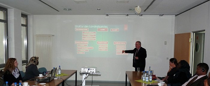 Im Anschluss wird ihnen das Landratsamt des Kyffhäuserkreises in Sondershausen vorgestellt. Die Aufgabe übernahm Verwaltungsleiter Dr. Heinz Ulrich Thiele. Thiele legte dar, wie sich der Kyffhäuserkreis insbesondere nach der Wende entwickelt hatte und ging dabei besonders auf die rückläufige Entwicklung des Kyffhäuserkreises bei der Bevölkerungsanzahl ein, und erläuterte die Entwicklung der Arbeitslosenzahlen.
