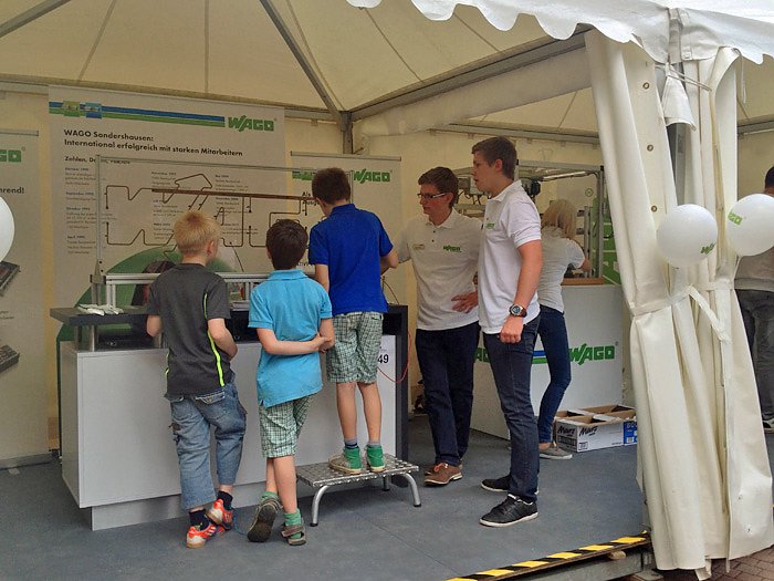 Per Shuttlebus ging es für die Besucher direkt vor die WAGO-Werkstore und natürlich auch zurück in die Innenstadt von Sondershausen. Hier präsentierten sich die Vereine, Unternehmen und Organisationen der Musik- und Bergbaustadt. Als einer der Hauptsponsoren des Thüringentages war WAGO mit einem großen Stand auf der Handwerkermeile vertreten. Hier durften die Besucher ihr ruhiges Händchen am Heißen Draht beweisen. Die Auszubildenden präsentierten das Modell eines Regalsystems, das sie selbst mit WAGO-Komponenten entwickelt und produziert hatten. Auch hier konnten Interessenten ihre technischen Fertigkeiten unter Beweis stellen und bekamen darüber hinaus Informationen über die verschiedenen Ausbildungsberufe in Sondershausen und deren Anforderungen aus erster Hand. Für uns ist der Thüringentag eine tolle Gelegenheit, die Ausbildung bei WAGO vorzustellen und unsere Arbeit direkt am praktischen Beispiel zu erklären – vor allem weil wir in Sondershausen noch neue Azubis suchen, erzählte der angehende Verfahrensmechaniker Maximilian Brückner.