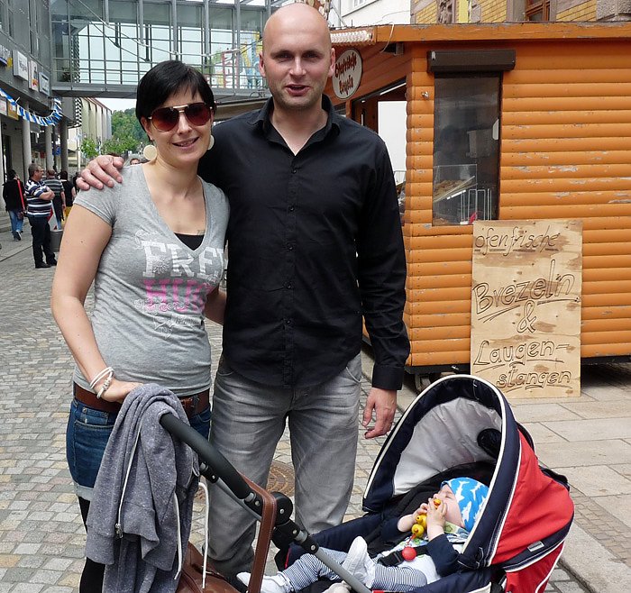 Apropos Olympiasieger. Auf dem Weg zur Präsentation traf kn in der Hauptstraße Olympiasieger Nils Schumann, der hier stolz seinen Nachwuchspräsentiert. Auch Nils Schuman ist ehrenamtlich aktiv, wenn man an sein Engagement für den schiefen Turm von Bad Frankenhausen denkt.
