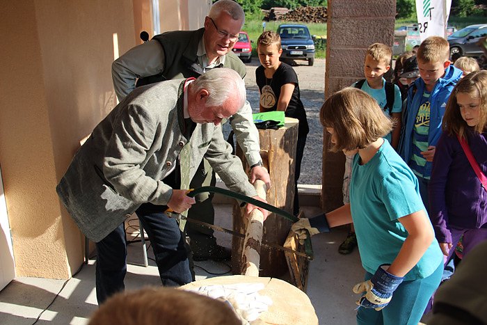 Gleichzeitig nutzte er die Gelegenheit, das frisch renovierte Jugendwaldheim zünftig einzuweihen. Es wurde nicht einfach ein Band mit der Schere zerschnitten, sondern gemeinsam mit einer Schülerin zersägte Minister Reinholz eine Fichtenstange. Interessierter Beobachter Forstamtsleiter Uli Klüßendorf.