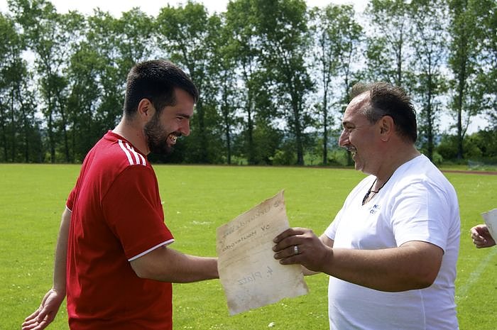 Der Torschützenkönig musste dann nach dem Finale zwischen Ur-Viehch Daniel Reitmann (Viehcher I) und Kreisoberliga – Knipser Enrico Illiger (Viehcher II) per Lattenschießen entschieden werden, beide hatten im Turnierverlauf sechsmal getroffen, Daniel Hinsche (Viehcher II / 5) und Kevn Renner (Reinsdorf / 4) folgten auf den Plätzen. In der fünfte .Runde entschied dann E. Illigäs Illiger dieses Duell hauchdünn für sich. Vor der Siegerehrung folgte dann wohl das Highlight dieses Cup’s, als unter der Führung des Chef – Choreografen A.Loukidis um die 60 Leute auf dem Platz den wohl längsten Sirtaki Thüringens tanzten. Danach wurden dann noch diverse Ehrungen vorgenommen, so wurde Kevin Renner von der TSG Reinsdorf als bester Spieler und Dominic Mennich (Bw91 – Junioren) als bester Torwart des Turniers ausgezeichnet. Auch der Hauterodaer SV ging nicht leer aus, sie wurden als fairste Mannschaft geehrt und konnten sich so über gut gekühlte Freigetränke freuen. Bei den inzwischen sommerlichen Temperaturen fand dies regen Zuspruch.