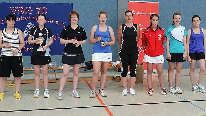Die Damenkonkurrenz war gekennzeichnet vom Durchmarsch von Nathalie Wolff (Foto) auf der einen Seite und dem anstrengenden Kampf von Katja Franke auf der anderen Seite. In den Gruppenspielen hatte Katja keine Probleme, gewann alle Spiele klar. Nathalie hatte gleich im ersten Spiel mit Isabelle Kronberg eine Nuss zu knacken. Im ersten Satz des Spieles stand sie sogar im Rand einer Niederlage, setzte sich aber letztendlich doch noch durch. Im anschließenden Viertelfinale konnten sich neben den beiden auch Susann Reich und Juliane Kronberg durchsetzen. Die Halbfinals waren eng, aber reichten für Franke und Wolff. Im Finale war dann der Kampfgeist von Katja Franke schnell gebrochen. Mit 11:4 und 11:1 holte die 13 jährige Nathalie den zweiten Pokal ins Haus Wolff nach Udersleben.