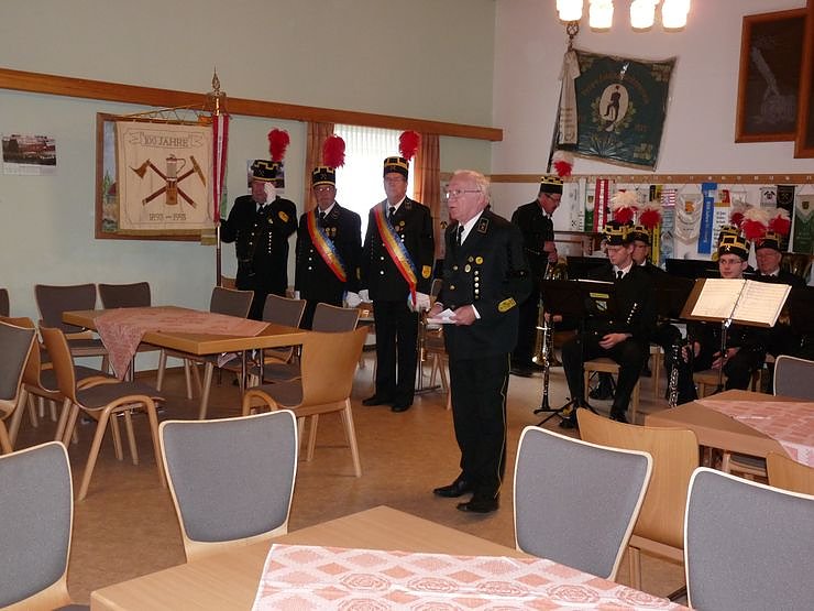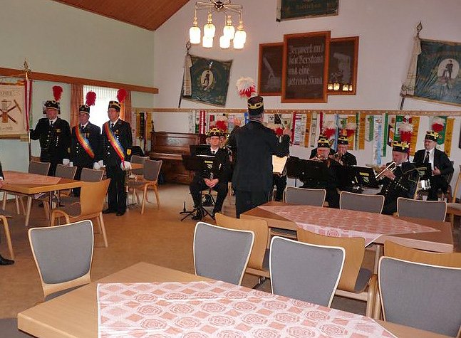 Weil es nicht genügend überdachte Plätze im Freien gab, zog man sich lieber ins Vereinshaus des Bergmannsvereins zurück. Schon die Kranzniederlegung in der Schachtstraße war durch den Regen nicht gerade vom Wetter verwöhnt worden.