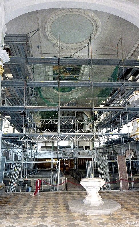 Und dazu wird in diesem Falle ein Gerüst im Inneren der Kirche benötigt. Dieses wird nicht nur wie bei einem Gebäude an den Wänden nach oben gebaut, sondern es muß in etwa 15 m Höhe eine begehbare Fläche von 23,5 m x 13,4 m = 314,9 qm entstehen, damit die Maler und Bildrestauratoren sicher arbeiten können. Sechs Etagen müssen dann die fleißigen Handwerker nach oben steigen, damit sie an ihre Arbeitsflächen kommen. Da ist es nicht ratsam etwas zu vergessen.