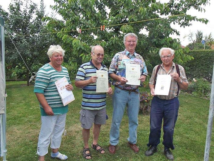 Nach der offiziellen Begrüßung durch unsere Vereinsvorsitzende, Rosemarie Treuse, zeichneten wir noch Vereinsfreunde mit Urkunden und Gutscheinen aus, die an unserer Wahl-Mitgliederversammlung im Januar 2013 nicht teilnehmen konnten. Dabei wurde auch noch aus dem Wettbewerb bester Garten 2012 unser ehemaliger langjähriger Fachberater Siegfried Schiebel ausgezeichnet. Für besonderes Engagement und besonderen Einsatz beim Kita-Projektgarten wurden Jürgen Salm, Gert Wölke und Wolfgang Treuse ausgezeichnet. Diese drei Gartenfreunde haben dieses Jahr einen Geräteschuppen als Anbau an die Kita-Projekt Laube errichtet und gleich mit Holzschutz und wetterfester Lasur versehen. Außerdem erhielt das Dach eine stabile Eineckung mit Teerpappe.