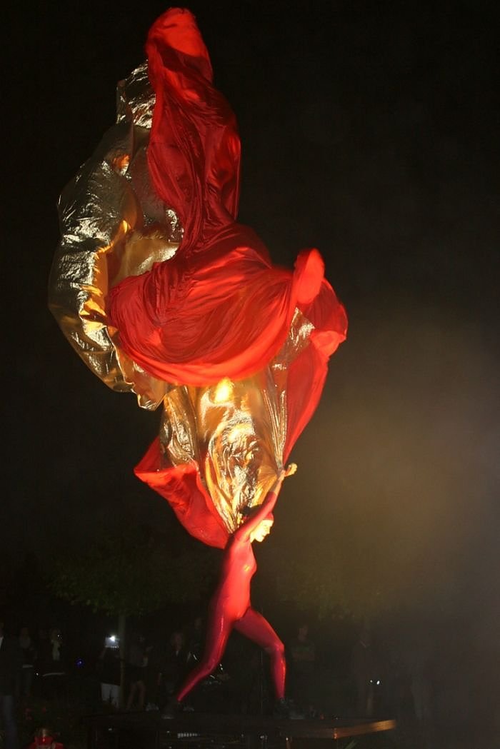 Mit Beginn der Dämmerung zieht am Rondell das HELMNOT THEATER mit einem der weltweit einmaligen Windriders und erstmals mit der prunkvollen, majestätischen und doch poetischen Roten Königin mit sechs Metern Höhe und fast sechs Metern Flügelspannweite die Aufmerksamkeit auf sich.