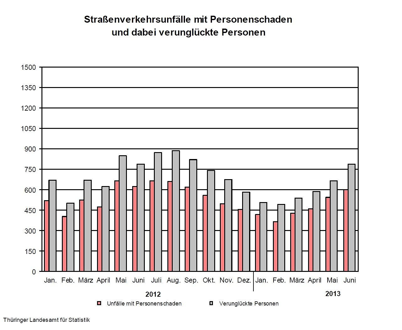Im ersten Halbjahr 2013 wurden nach Mitteilung des Thüringer Landesamtes für Statistik auf den Thüringer Straßen 26 595 Straßenverkehrsunfälle durch die Thüringer Polizei aufgenommen. Das waren 103 Unfälle bzw. 0,4 Prozent weniger als im ersten Halbjahr 2012.