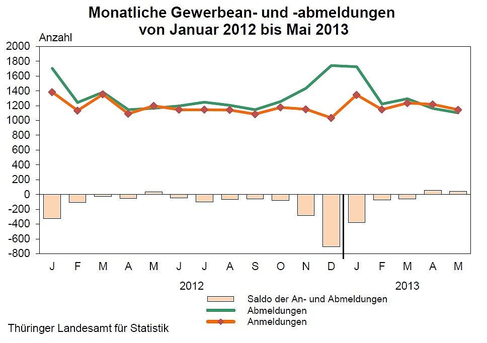 Die Zahl der Neugründungen ging gegenüber Januar bis Mai 2012 um 1,9 Prozent auf 4 959 Anzeigen zurück, die der Betriebsgründungen sogar um 12,9 Prozent auf 1 287 Unternehmen. Hauptgrund der Gewerbeabmeldungen war in 80,0 Prozent der Fälle die vollständige Aufgabe des Gewerbes. Es wurden 3,9 Prozent weniger Gewerbe vollständig aufgegeben als im Vorjahreszeitraum. Darunter befanden sich 1 411 Betriebe mit größerer wirtschaftlicher Substanz (- 12,2 Prozent).