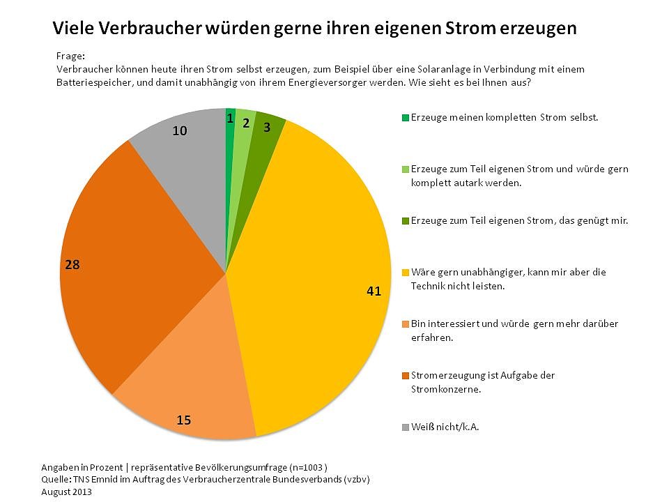 15 Prozent der Befragten finden die Idee, eigenen Strom zu erzeugen, interessant, wissen jedoch noch zu wenig darüber. Wir begrüßen es, wenn Verbraucher ihren Strom selbst erzeugen und die Energiewende mit vorantreiben, sagt Holger Krawinkel, Bereichsleiter Verbraucherpolitik beim vzbv. Nur gut jeder Vierte (28 Prozent) meint, dass die Stromerzeugung in der Hand der Energieversorger bleiben sollte. Angesichts des Kostenrückgangs bei Solarmodulen und der technologischen Entwicklung von Batteriespeichern sei davon auszugehen, dass der Eigenverbrauch in den nächsten Jahren stark zunehmen wird, so Krawinkel.