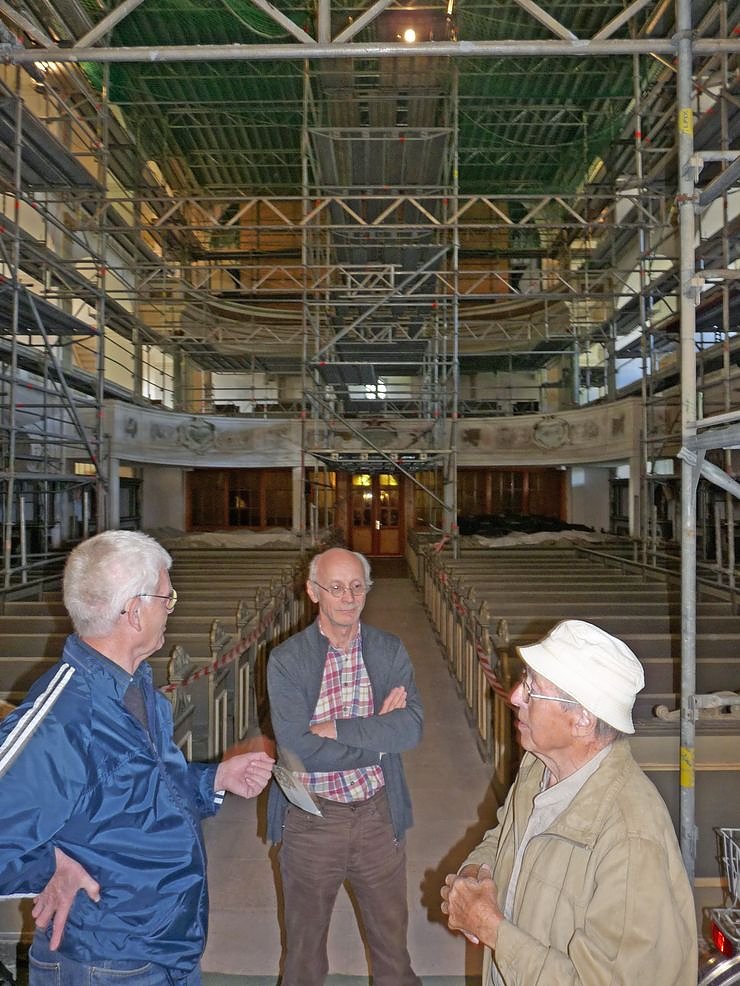 Im Vorfeld hatte der Ehrenbürger der Stadt Bad Frankenhausen, Fritz Wallrodt (re.) die Mühe gemacht, und mit seinen 90 Jahren das Gerüst erklettert, um Peter Zimmer (li.) vom Förderverein der Unterkirche und Herr Seifert das Gemälde übermalt hatte. Auch wenn kn dabei war, wollen wir dem Vortrag nicht vorweg greifen, nur mit den Bildern, weil man so schnell nicht wieder an das Bild ran-kommen wird.