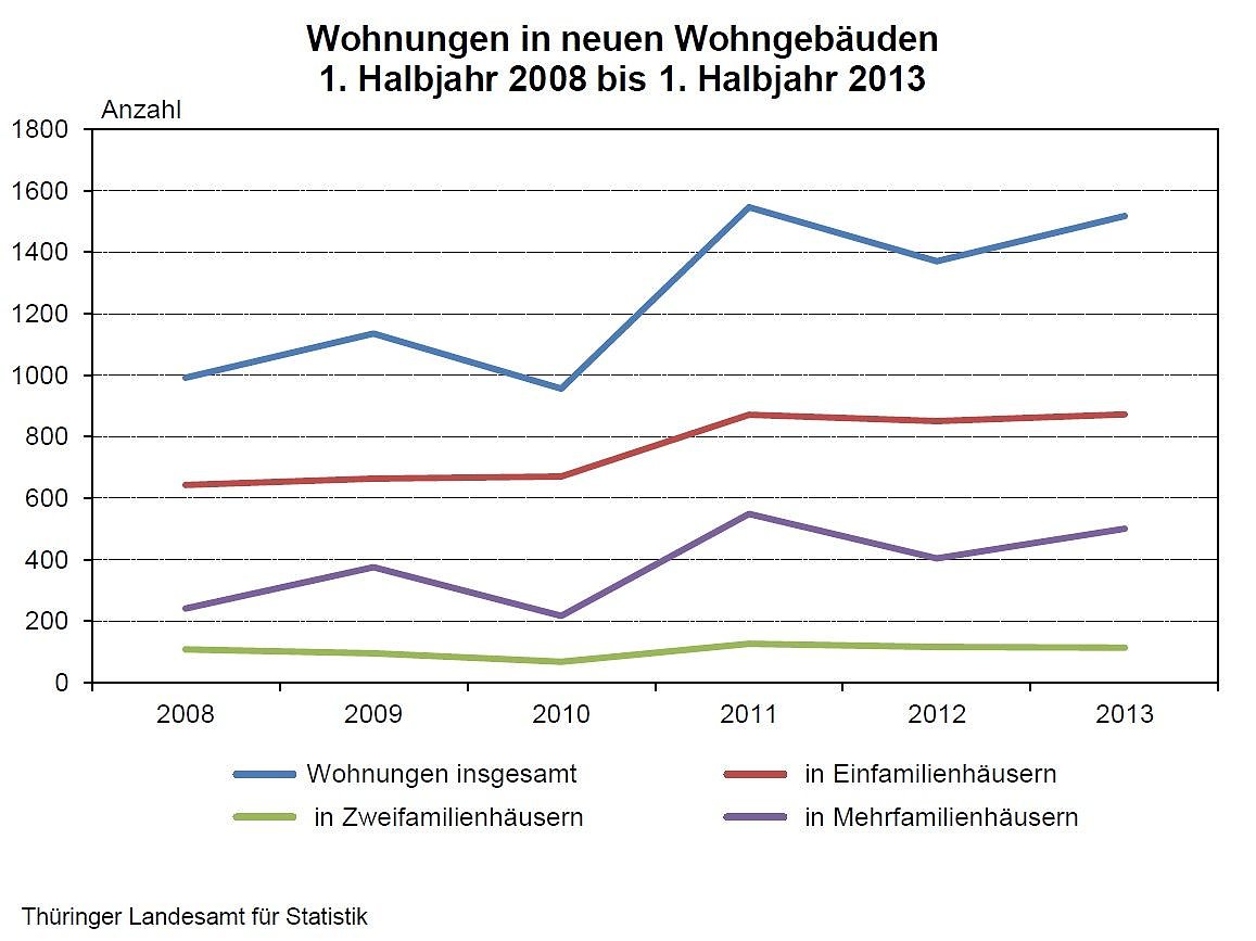 Bei der Wohnungsbaunachfrage, die sich in den Genehmigungen für Bauvorhaben widerspiegelt, stieg die Anzahl der Wohnungen nach Mitteilung des Thüringer Landesamtes für Statistik im 1. Halbjahr 2013 gegenüber dem Vorjahr um 8,4 Prozent. Die Thüringer Bauaufsichtsbehörden genehmigten im Wohn- und Nichtwohnbau insgesamt 2 016 Wohnungen...