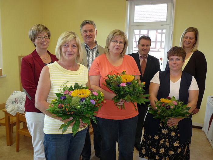 Autor: khhMit einem Blumenstrauß wurden Frau Jäkel, Frau Drisch und Frau Ey heute offiziell verabschiedet. Das Ganze passierte in der Kindereinrichtung Rockensußra, die morgen das letzte Mal geöffnet haben wird. Zusammen mit Ebelebens Bürgermeister Uwe Vogt (SPD) verabschiedete Joachim Schmidt vom Trägerwerk Soziale Dienste die zwei Erzieherinnen und eine Reinigungskraft. Er bescheinigte ihnen nochmals, dass sie ein hervorragende Arbeit geleistet haben und es nicht an ihnen liegt, dass diese Kindereinrichtung geschlossen werden musste. Bisher fanden nur die zwei der Erzieherinnen eine neue Aufgabe in einer anderen Kindereinrichtung, so u.a. auch bei den Helbespatzen in Ebeleben.