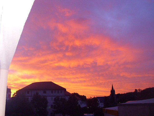 diesen Sonnenaufgang mit Morgenrot und Wolken als Vorboten dessen was uns wenig später erwarten sollte, nämlich den ersten Regenschauer habe ich gestern, Sonntag morgen um 6:27 Uhr einfach mal schnell mit der Kamera aus dem Balkonfenster heraus geknipst und dokumentarisch festgehalten.