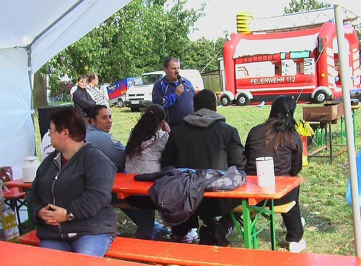Klaus-Dieter Mosebach, Beauftragter für die Betreuung der Asylbewerber, begrüßt die nicht gerade zahlreich erschienen Gäste aus dem Ort. Neben Spielen für Kinder gab es auch ein Fußballspiel.