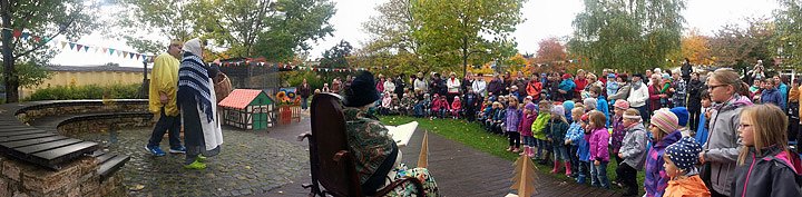 Doch genau zum Programmstart hörte es auf zu regnen und alle konnten gespannt der Aufführung zuschauen. Kleine und große Ohren lauschten gespannt, sie bestaunten mit leuchtenden Augen dem Kartoffelkönig der lecker selbstgemachte Kartoffelpuffer verteilte.
